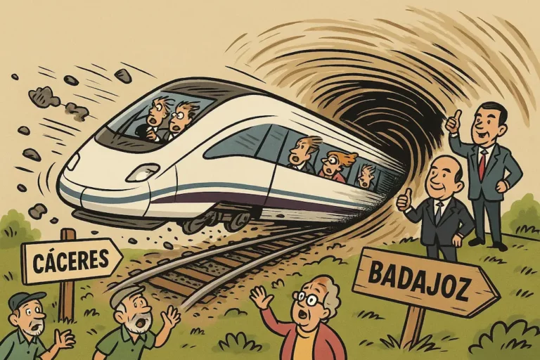 El nuevo AVE Madrid–Barcelona será tan rápido que se desviará hasta Extremadura por error cuántico, causando caos y humor ferroviario.