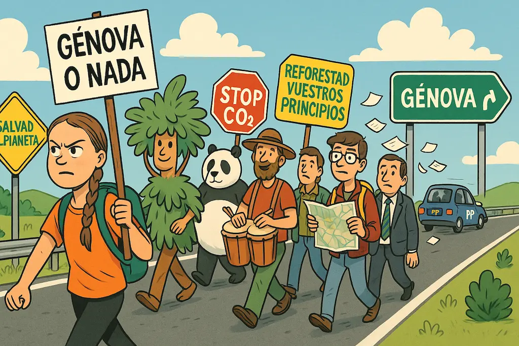 La marcha, improvisada pero decidida, ha tomado forma de peregrinación laico-política con tintes de festival rural: participan jóvenes activistas con pancartas, jubilados indignados que pensaban que iban a un mitin de Podemos, y hasta una batucada feminista que se unió «por el ritmo y por la metáfora». Greta lidera la columna con una camiseta naranja y una pancarta que dice: “Congreso o Contragolpe”.