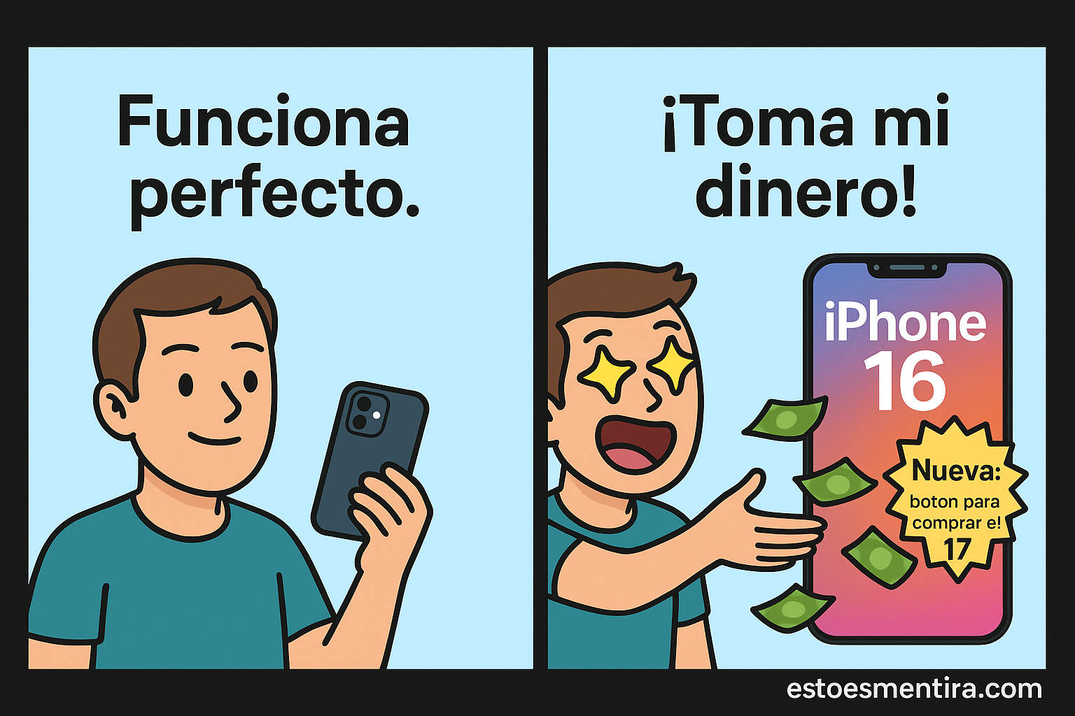 - Mi iPhone 15 funciona perfecto; el 16 funciona igual, pero con botón directo para comprar el 17. Productividad financiera en 120 Hz.